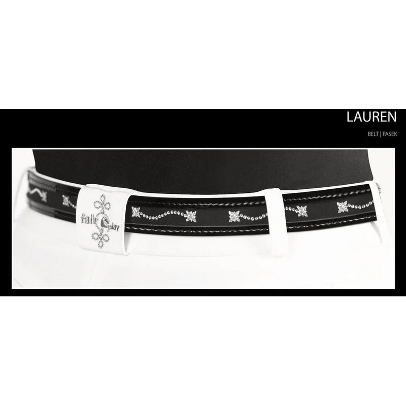 This gorgeous belt is made of high quality Italian patent leather. It is decorated with rhinestone scrolls ending in starlike bursts.