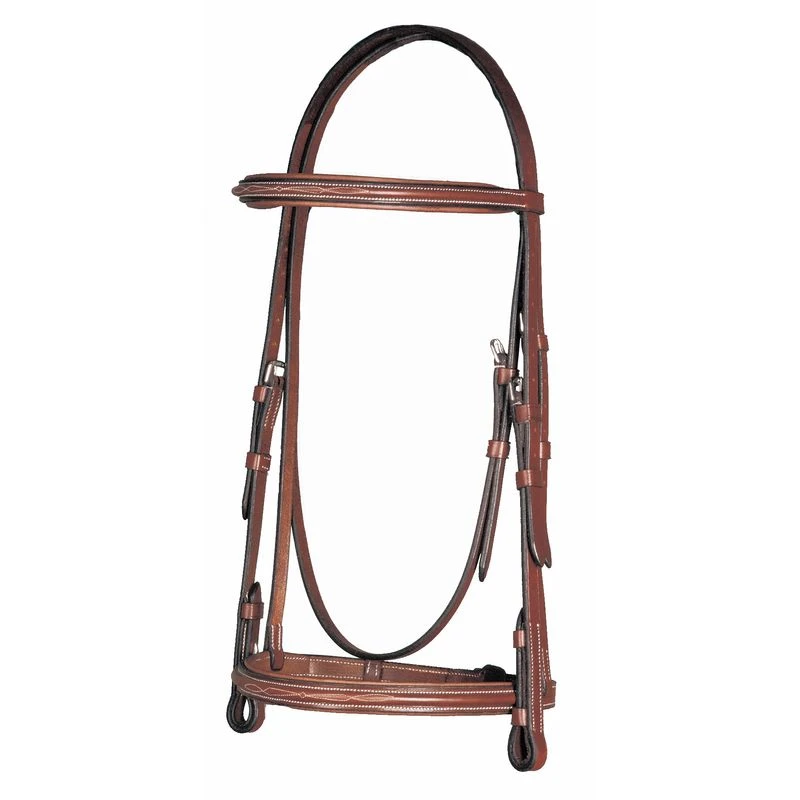 Padded bridle with raised fancy stitch nose and browband with hook stud ends. Reins are raised fancy stitched leather measuring 5/8″ wide x 54″ long.