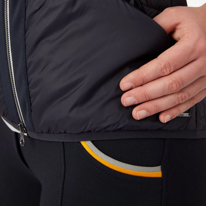 This functional women’s vest has light padding and is quilted at the sides and has a oneside stretch fleece panel at the back middle and also at back of sleeves, to provide optimal moveability when riding. Contrasting piping at hem, armholes and zipper. Water repellent and windproof, this is a perfect option for layering. 3D logo print on the back below the neck and a small metal logo plate at the front hem. Two hidden zipper pockets for keeping your belongings safe during rides.