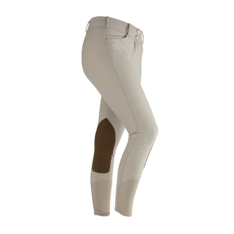 Made with a classic color and Clarino kneepatch, this breech feature a 2 wide waistband with belt loops, two handy front storage pockets, and a mid rise. The Euro seat design gives a flattering look to every rider. Additionally, the moisture wicking sock bottom provides comfort and a seamless fit underneath your boots.